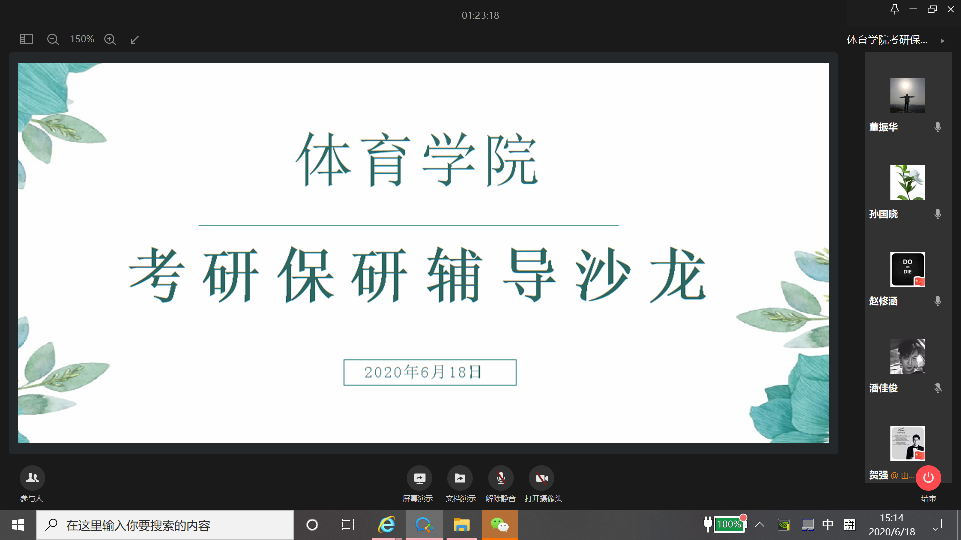 6月18日下午,新葡萄AMG官方网站为有考研意向和保研可能的学生举办线上“考研保研辅导沙龙”,邀请了社会体育系贺强、李拓建、朱启莹、张宪亮、孙国晓、赵修涵等六位年轻优秀教师参加,学院党委副书记周庆华出席并讲话,沙龙由辅导员袁淑娟主持。