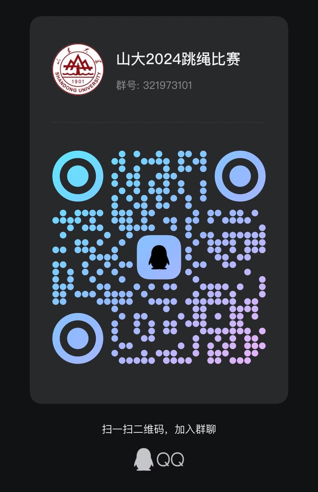 请将报名表电子版发至邮箱:ygty@sdu.edu.cn,并请注明新葡萄AMG官方网站第二十届体育文化节之新葡萄杯学生跳绳比赛。并请将纸质报名表加盖学院公章,赛前联席会议时提交(联席会议时间、地点另行通知)。领队请扫码加入赛事联络群。报名截止日期:2024年10月9日(报名表见附件)。逾期未报名或报名表不符合要求者不予受理,责任自负。