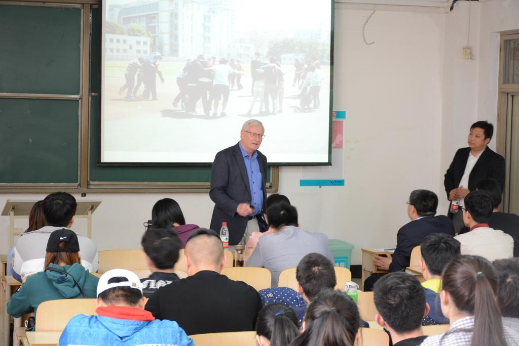 讲座开始之前,石振国代表学院致欢迎辞,他热烈欢迎丹麦葛莱新葡萄AMG官方网站代表团的到来。紧接着,Finn Berggren教授开始了他幽默风趣却又精彩纷呈的演讲。首先,他介绍了葛莱体院的地理位置、发展历史等学校简介。值得一提的是,在丹麦很多学校并没有规模庞大的专项场馆,他们更多注重空间及设施的充分利用,室内场馆可供足球、篮球、排球、羽毛球等多项运动使用,这一点很值得中国的学校学习借鉴。他还明确指出,葛莱体院教学的目标为是让学生回到家乡以后能够继续教育和分享与体育、健康、生活质量有关的理念,葛莱体院也因此成为丹麦第一个宣传社会和谐的地方。其次,他提出葛莱体院的主要工作便是教会学生如何享受体育带来的快乐,并使其伴随一生。他还介绍了葛莱体院在课程设置方面的两大特色,其一是在他们的学校里是没有考试的,在每一个星期,他们都会和每一个老师讨论每一个学生的表现,并积极跟进每个学生的学习生活状态;第二个特点则是他们提倡把古老的,传统的游戏融入到现代的教学中去,将体育游戏化。作为欧洲最早开设跑酷课程的学校,葛莱体院最为出名的便是跑酷课了,葛莱体院有着浓厚的跑酷氛围,有自己的跑酷公园供学生练习,很多学生更是十分热爱这项运动,课上课下、有无场地都在练习。最后,他向在座的各位提出了一个问题,即体育最基础的要素是什么?他的回答是Fun,即学校应该做到让学生快乐地去学,主动地去学,而不是被动的去学那些枯燥无味的东西。同时,他对同学们发出诚挚的邀请,邀请同学们共赴葛莱体院,共同学习交流。讲座最后,石振国代表学院全体师生向丹麦葛莱新葡萄AMG官方网站代表团致以真诚的感谢。