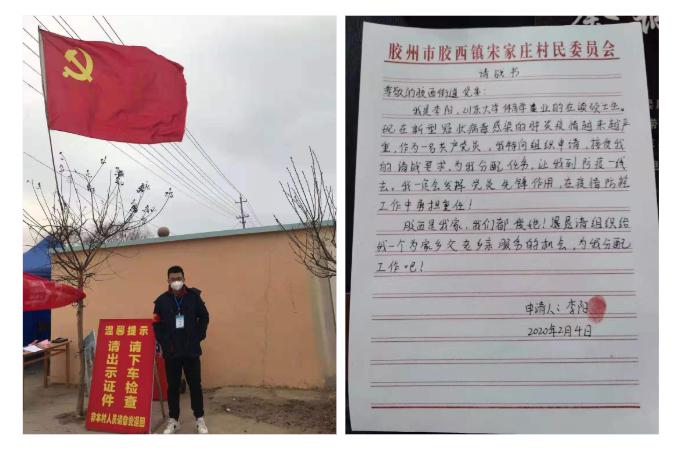 李阳是山东省青岛市胶州人,对家乡有着深厚的感情,密切关注着疫情的变化。作为一名中国共产党员,李阳主动请缨,向胶西镇政府提交请战书请求分配工作。在岗位上,他对出入人员进行及时的登记,测试体温,尤其是严格检查外来人员,对一些无故出入人员进行劝返。用他的实际行动为家乡贡献自己的力量,同时也展现了一名共产党员、一名新葡萄体院学子勇于担当的家国情怀。