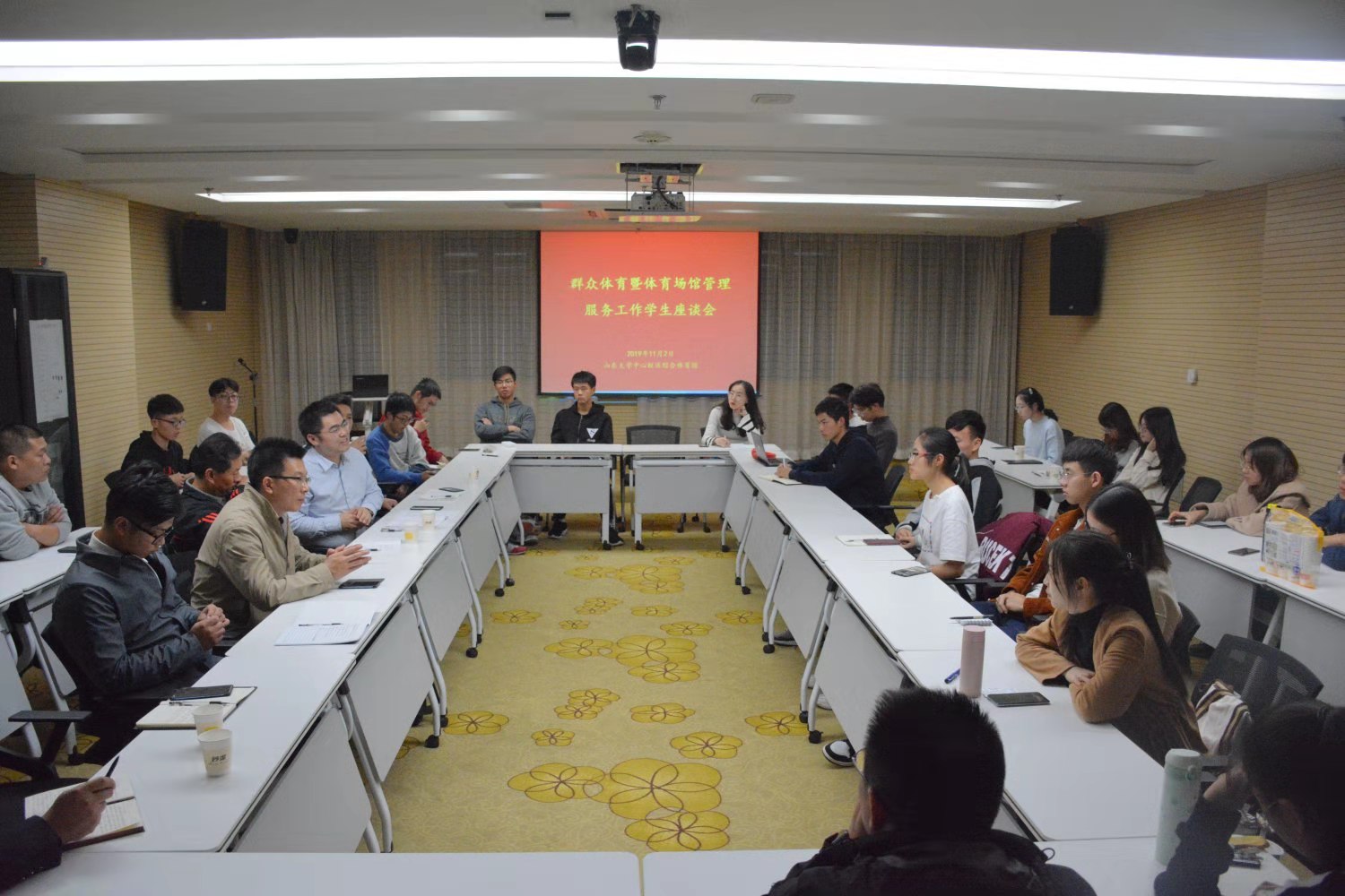11月2日至3日,为充分听取学生对学校群众体育发展的建议及要求,新葡萄AMG官方网站联合党委学生工作部、党委研究生工作部、团委、齐鲁医学院学生处、兴隆山校区办公室,分别在中心校区、趵突泉校区、兴隆山校区、软件园校区召开新葡萄AMG官方网站群众体育体育设施管理工作座谈会,新葡萄AMG官方网站党委副书记周庆华主持座谈活动,新葡萄AMG官方网站副院长徐剑波,兴隆山校区管理办公室副主任菅维星,体育场馆管理中心、各校区管理办公室老师及各学院学生代表参加了座谈。