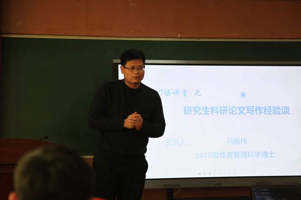 冯振伟将论文的选题划分为国家社科基金立项导向、期刊发文导向、健康中国2030政策导向以及国家十三五规划导向,并为大家解读了《武汉新葡萄AMG官方网站学报》《体育学刊》《沈阳体育学报》等核心期刊,分析了各个期刊中选题的规律。他鼓励大家阅读大量的论文,学习优秀文章的架构,在借鉴他人研究的基础上,构建自己的文章框架。同时,冯振伟提到要在文章中构建二级标题及小标题,标题之间可以是并列关系、递进关系、因果关系等。此外,他认为论文的写作还需要注意写作规范。论文的表达需要采用学术语言,尤其是题目和摘要部分,一方面要表达清楚,另一方面要具有新意;高质量的论文不仅学术水准高,而且具有传播性、创新性及规范性等共同特征。此外,冯振伟针对研究生的学习定位与未来发展方面进行了阐述。他认为研究生应该是技能与科研并存的优秀人才,要重视科研、勇于担当、具有自信并努力刻苦。