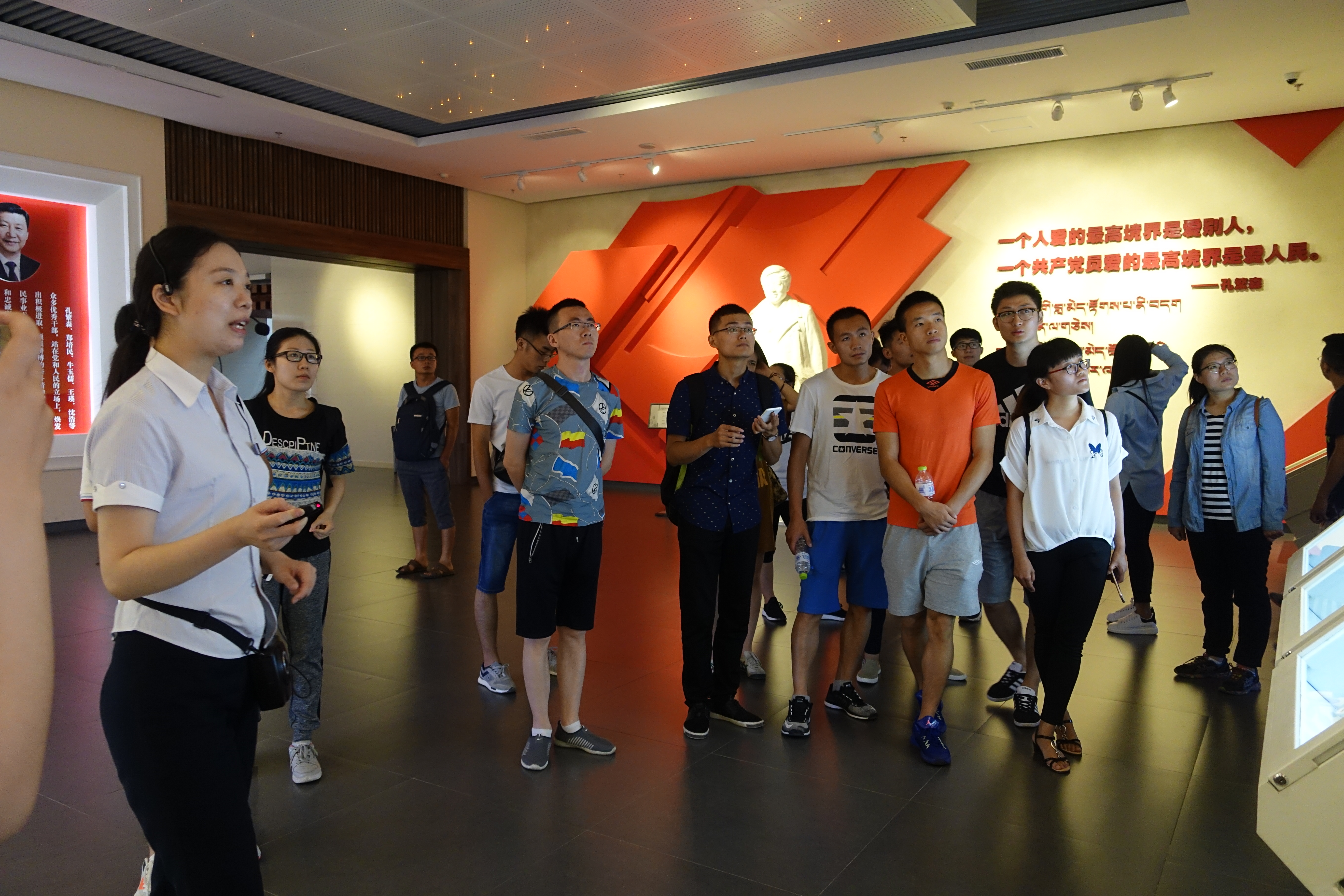上午9点,在学院本科生党支部书记范泽斌老师的带领下,学院党员同学们来到了“全国爱国主义教育示范基地”、“全国党员干部教育基地”、“山东省党员教育基地”——孔繁森同志纪念馆。走进孔繁森同志纪念馆,全体党员首先面向孔繁森同志大型半身塑像深深三鞠躬,缅怀这一位党和人民的优秀干部。缓步进入纪念馆展厅,孔繁森同志当年的一件件破旧的衣服、简单的生活用具映入眼帘,一幅幅铮铮铁骨的豪言,让党员同学们肃然起敬。纪念厅内安放着孔繁森同志大型汉白玉半身塑像,塑像后红色屏风上镌刻着第一部分“齐鲁赤子”,展示了孔繁森在山东生活、工作的状况,以及从一个普通农民的儿子成长为一名党的领导干部的光辉历程;第二部分“汗洒雪域”,展示了孔繁森两次赴藏工作10年间,为西藏的建设,恪尽职守、忘我拼搏、开拓进取、求真务实的精神风貌;第三部分“情系高原”,展示了孔繁森热爱人民、服务人民、为民解难、无私奉献的满腔热忱;第四部分“廉洁清正”,展示了孔繁森艰苦朴素、廉洁自律、一身正气、克己奉公的高贵品质;第五部分“深切怀念”,展示了孔繁森不幸殉职后,山东、西藏及全国各地群众深切悼念孔繁森的感人情景;第六部分“光耀神州”,展示了党中央对孔繁森的高度评价,以及在党中央号召下,全国各地广泛开展学习孔繁森精神的情况。同学们在纪念馆内跟随着讲解员的步伐,静静聆听讲解,仔细观看展览,认真学习孔繁森精神。
