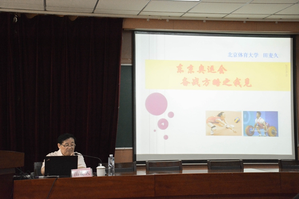 田麦久教授作了以“东京奥运会备战方略之我见报告”为主题的报告,报告中提到中国需要正视运动员里约奥运会赛季的滑坡现象并认真总结经验教训,努力改变我国竞技体育的发展环境和努力提高竞技体育管理与运动训练科学化水平三个方面。田麦久教授通过历届奥运会赛绩比较推断,中国将在2020年东京奥运会中面临多重危机,主要包括中国按照以往几年的后退情况可能会后退至第二集团以及由于奥运会举办国“金牌效应”中国可能会被日本超过等。因此,他提出了对提高训练和参赛的科学化水平的四项要求:第一,制定并且实施奥运中周期的4年训练规划;第二,全面推进运动员经济能力的靶向发展;第三,科学组织符合与恢复的协同机制;第四,准确把握竞技状态发展与变化的规律。田麦久教授随后对目前社会群体贬低竞技体育的社会功能的几个流行观点作了探讨,主要有健身是体育唯一的本质功能、竞技体育的发展违背体育的本质功能以及竞技体育抢了健身体育的“蛋糕”等方面。为了让同学们更加了解体育,田麦久教授对体育的多元功能以及其组织管理、体能训练的功能、竞技体育的社会功能、健身体育与竞技体育的的联系区别一一作了解释。