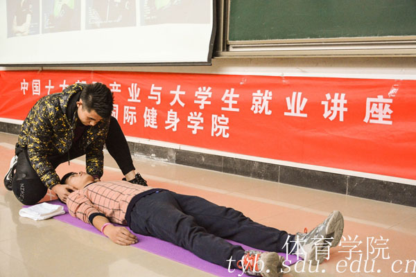 范泽斌介绍了主要针对大学生进行全能教练人才培养,以济南为中心,辐射全国的GT国际健身学院,并指出健身事业是社会体育指导与管理专业学生的就业方向之一。随后一段运动健身的短视频引出本次讲座的主题。讲座伊始,赵伟对现阶段就业形势作了分析,数据展示现高校毕业人数已创历史最高,可堪称史上更难就业季。因此大学生创业已成为更多人的选择,但大学生创业成功率低却是不争的事实。随着经济的发展,健身也越来越成为世界的主流,2008年奥运会便是中国健身事业的契机,健身人数增长,使得健身教练成为热门职业。赵伟通过讲述自己的求职经历,表明现在人们健身意识的提高,体现了健身行业未来会有更大的发展前景。随后赵伟介绍了健身教练的职业特点和作为健身教练应具备的专业技能。除此之外,他还谈到现在健身事业拥有国家政策的支持,对于新葡萄AMG官方网站学生们的就业方向,健身事业是一个不错的选择。GT健身大明湖健身学院主管寺存胜通过现场纠正学生的高低肩,直观的介绍肌肉拉伸方面内容,展示了健身的种种益处。赵伟介绍了几位是GT国际健身学院会员的新葡萄AMG官方网站学生,其中2015级欧柱福就自己这两年的健身经历向同学们分享自己的感受、心得,让同学们对健身的认识更加深刻。2016级新生将于25日前往GT国际健身学院奥体中心分馆,亲身体验各种健身项目。
