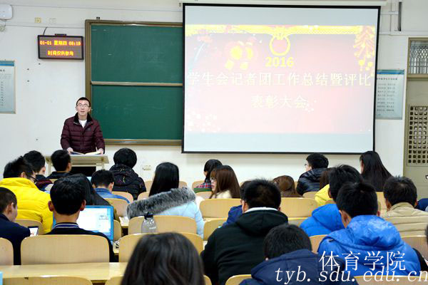 本次会议由学生会副主席朱景鉥主持。会议伊始,学生会、记者团的各部门部长依次上台,通过ppt展示等形式对本学期工作进行总结,并对下一学期的工作计划进行报告。学生会部长们总结内容主要包括各类活动的宣传、开展、收尾状况,干事们在组织活动中的参与程度以及在下学期将举办有关体育创新的活动。记者团各部长则是针对学院本学期的宣传工作进行总结,其中包括学院官网以及学校各大网站新闻稿的发布情况、学院运营的微信公共平台的关注量以及对干事的培养。随后,学生会主席刘强、记者团团长刘文娜在部长汇报的基础上总结了本学期新葡萄AMG官方网站在活动举办以及活动、赛事宣传方面所取得的成果,并提出干事们应该积极参与组织活动、做好自己的本职工作的要求。范泽斌分别对学生会、记者团的优秀学生干事进行了表彰,以资鼓励。