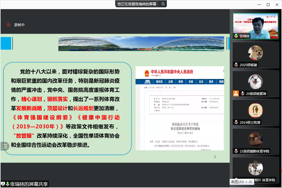 7月14日下午,吉林省体育局局长张瑞林教授做客新葡萄AMG官方网站暑期学校,进行了以《体育强国建设视域中的我国“十四五”体育改革与发展》为题的专题讲座。张瑞林教授从“十三五”时期我国体育发展取得的成就讲起。他说道,我国全民健身国家战略已经深入实施,竞技体育也取得了斐然的成绩,青少年体育活动也在广泛开展,体育产业在国民经济中的地位和作用显著提升,体育文化在培育社会主义核心价值观中作用越来越凸显,体育对外交流与合作日益扩大。接着,张瑞林教授对未来“十四五”体育的改革与发展进行了系统的讲解。最后,张瑞林教授就学员们所提出的问题一一进行了解答和交流。