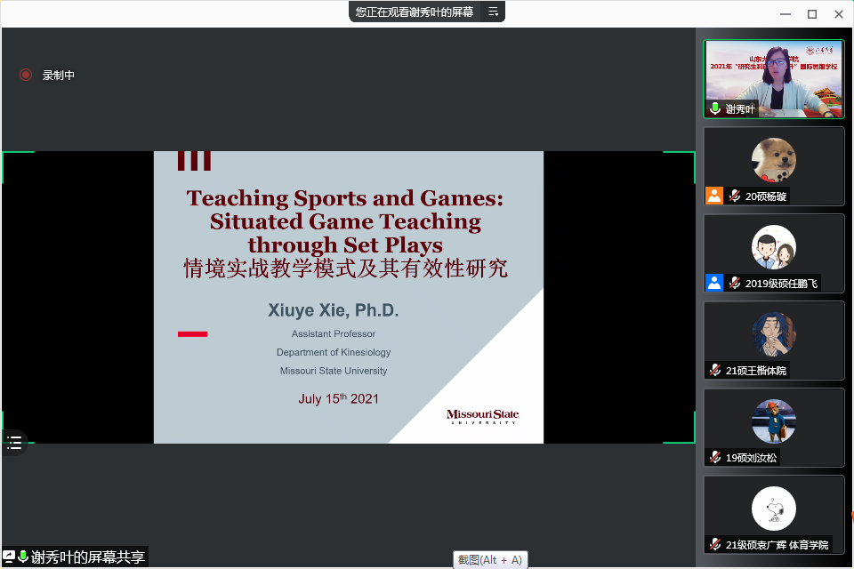 7月15日,新葡萄AMG官方网站优秀校友,2014届硕士研究生、密苏里州立大学助理教授谢秀叶博士受邀作了题为《情景实战教学模式及其有效性研究》的主题讲座。谢秀叶博士说明了该讲座的主题背景及形式,她讲到其相应的研究主要是关于教学模式的提出、教学模式有效性的验证、教学模式在不同年级和不同体育运动项目的应用和研究。接着,谢秀叶博士从提出的三个问题进行导入,她请学员们思考“体育教学的目标是什么”、“学生的技战术能力是如何发展的”、“技术和战术之间的关系是什么”,引发学员深思。随后,谢秀叶博士从情景实战教育模式介绍、情景实战教育模式的应用与技巧和情景实战教育模式研究三个方面进行了详细的讲解,带来了精彩的学术讲座。