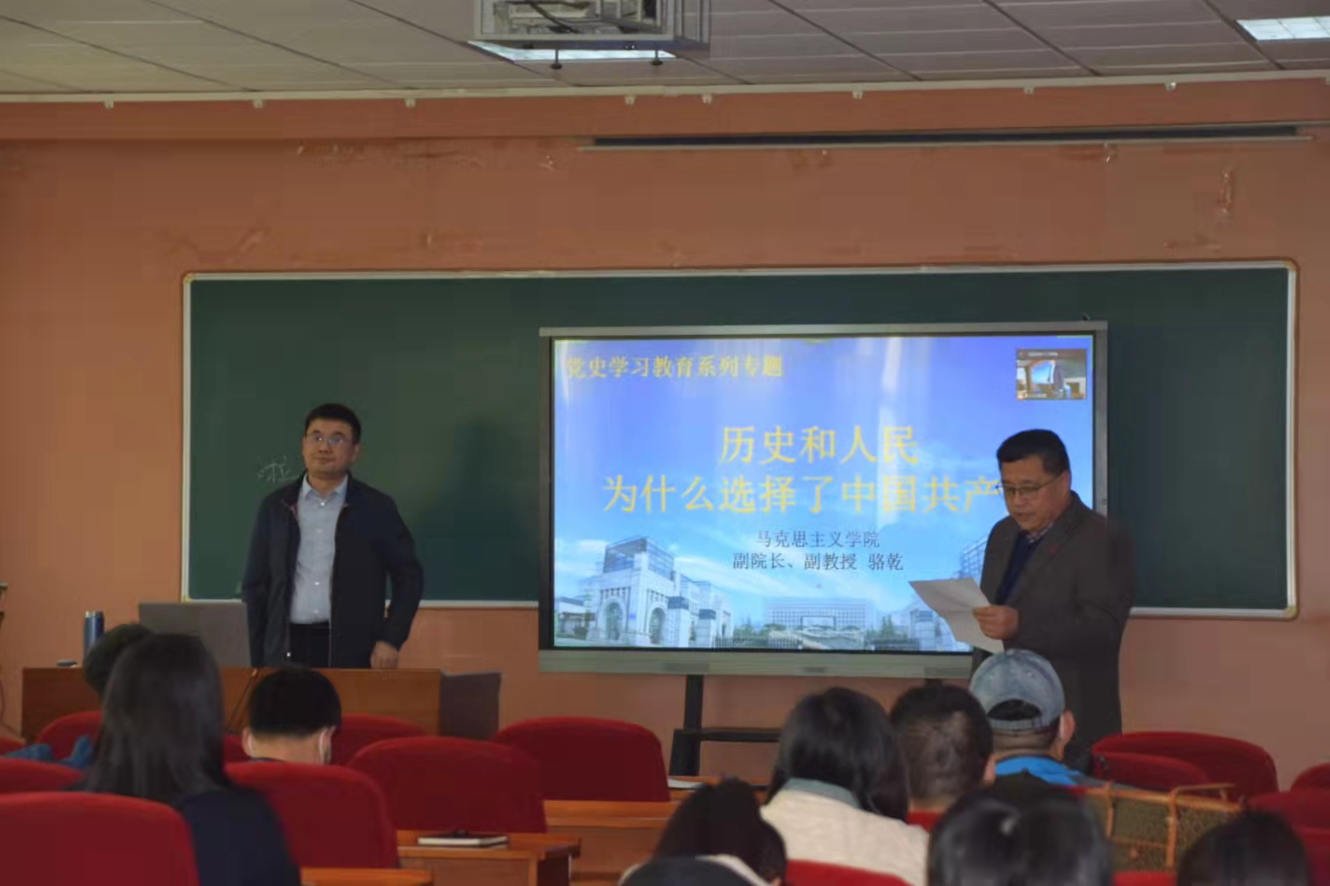 骆乾副教授引经据典,从唐太宗的“夫以铜为镜,可以正衣冠;以史为镜,可以知兴替”,到毛主席的“古为今用”,使师生们从中国悠久历史中感悟体会中国共产党的历史进程。骆乾副教授的报告内涵丰富、声情并茂,现场师生均认真聆听,引发大家的深入思考。