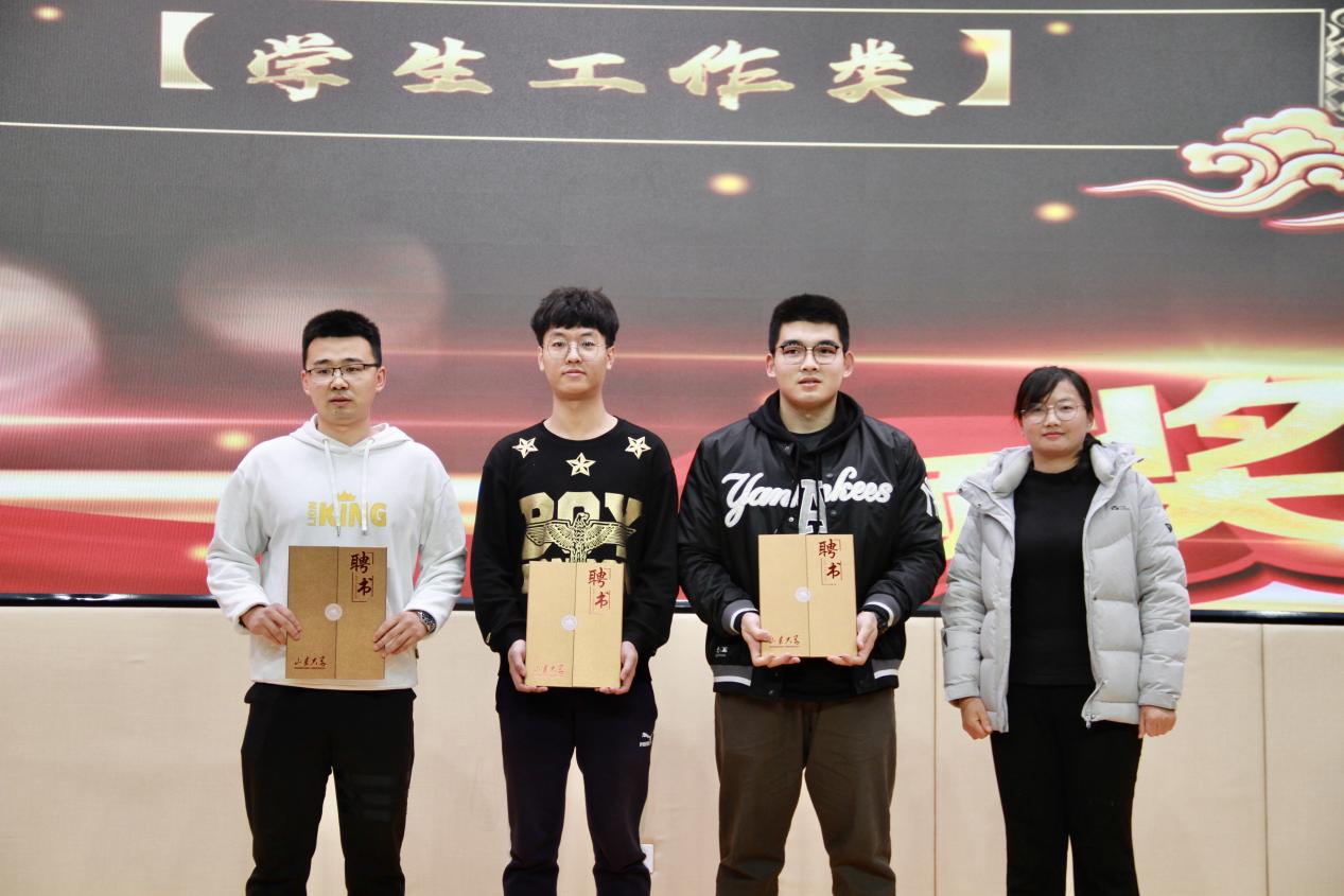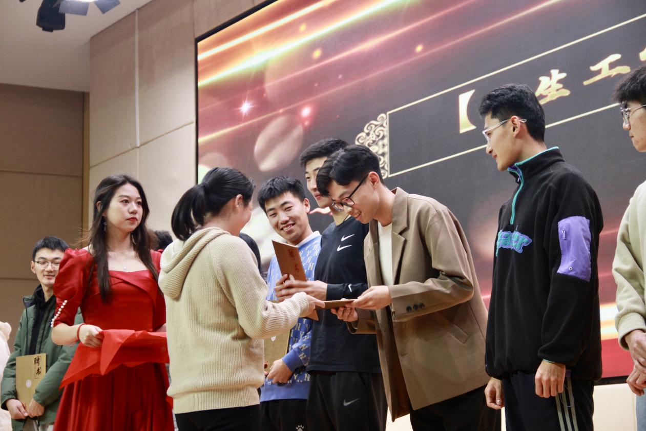 “先进集体类”奖项,第一项颁发的是“新葡萄AMG官方网站第七届互联网+大学生创新创业大赛获奖团队”由张文涛等八人组成。2019级本科生张文涛鼓励大家进行科研,提高综合能力,利用好新葡萄AMG官方网站的平台资源,抓住机会。还有董昊煜等7人组成的本科生课外学术科技作品结项团队;张羿钊等5人组成的社会实践活动校级优秀团队。在今年的新葡萄杯篮球赛中,新葡萄AMG官方网站研究生和本科生男篮均取得了好成绩,获得了“新葡萄AMG官方网站篮球队激励奖”,篮球队队长陈龙、杨紫坤上台领奖。为保障校园文化建设,学院成立了自己的艺术团,由江承昊等7人荣获“艺术团激励奖”。艺术团代表2020级江承昊团长向大家介绍了艺术团的组成,同时表达了自己对艺术团的期望,希望同学们积极参与到艺术团的活动中。开心的时刻到来!由相声协会表演的节目《作茧自缚》带来了一片欢笑声。
