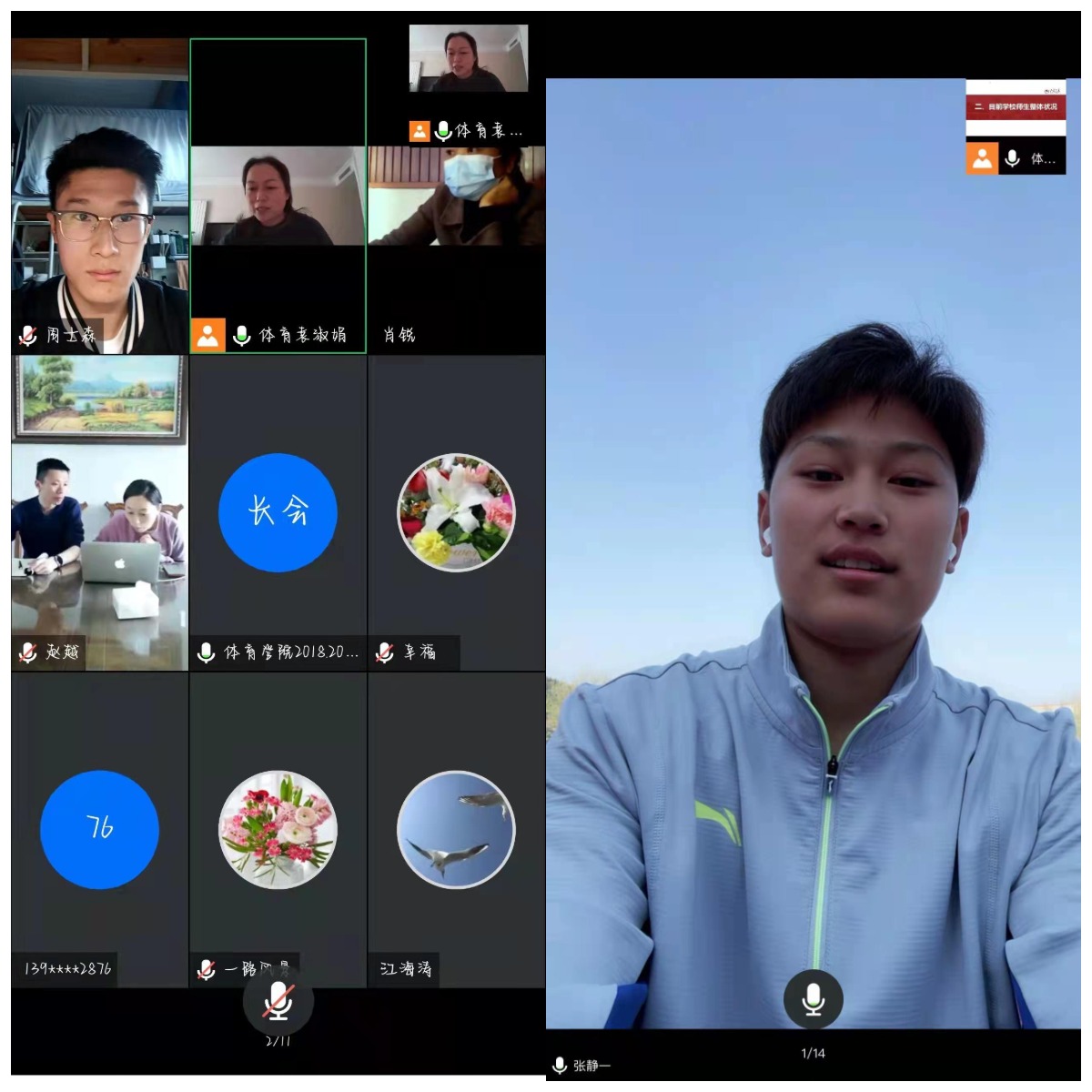 会议上,学院各年级辅导员向家长们介绍了学校目前疫情防控的相关情况,重点交流了当前学校封闭状态下的学生思想状态、管理规定、线上教学和物资保障情况。会上也邀请了几名本科生和研究生代表同学,向家长们介绍了当前同学们的所思、所做、所感,他们分别在教室、运动场地、宿舍向家长实况展示了同学们开展正常学习、生活和训练的情况,让家长进一步放心。