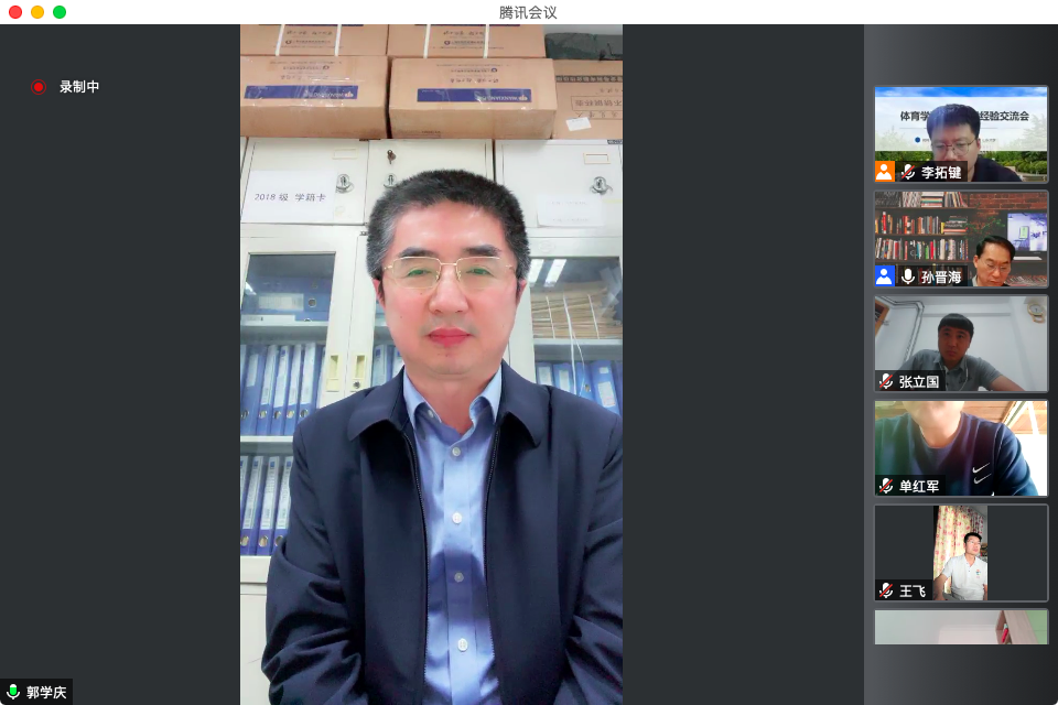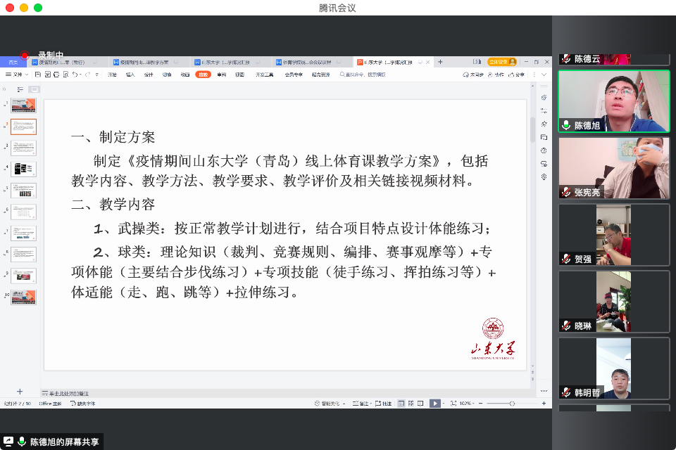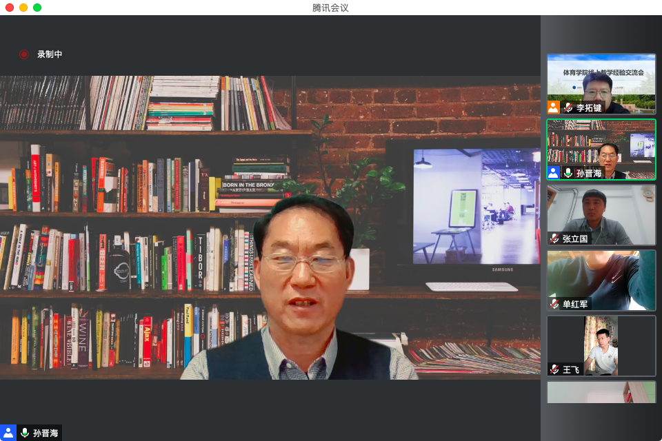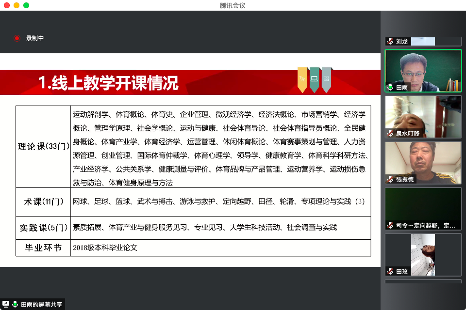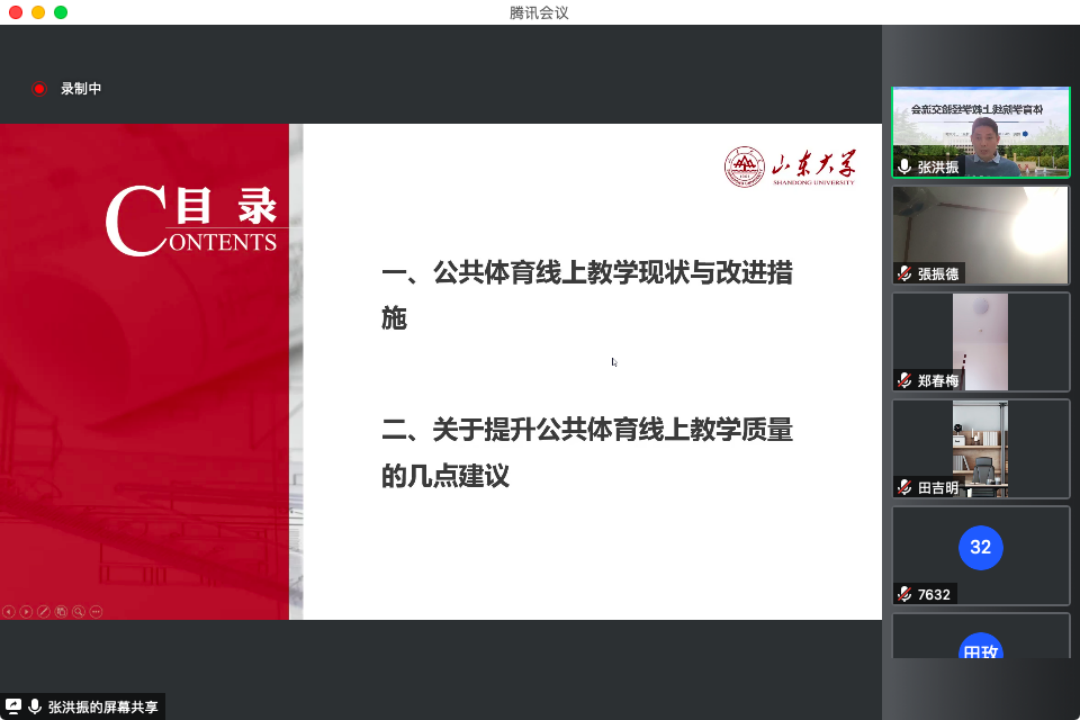 社会体育系主任田雨、青岛校区副主任陈德旭、足球教研室主任徐勤昌、篮球教研室主任牛海涛、排球教研室主任谷弘波、田径(体能)教研室主任单红军、武术教研室主任王杰、健美操教研室主任郝怀霞、综合(新兴)项目教研室主任韩明哲、训练竞赛教研室主任祝曦东分别汇报了各教研室的线上教学情况。