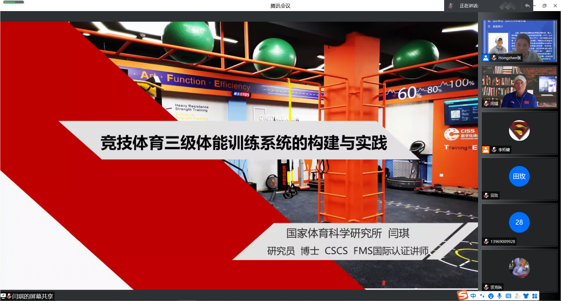 闫琪作了题为“竞技体育三级体能训练系统的构建与实践”的主题讲座,从竞技体育训练金字塔模型的身体功能训练、基础体能训练、专项体能训练三种训练以及科技引领训练这四部分展开阐释。在科技引领方面,闫琪强调科技是体能训练质量提升的关键,应用于运动员竞赛状态监控,身体基本功能评定,耐力、力量、爆发力测试与训练、身体恢复再生等各个环节。在身体功能训练方面,闫琪表示身体功能训练作为竞技体育三级体能训练系统中的基础环节,主要目的是防止运动损伤、提高竞技能力、强化心理品质,身体功能训练不是以强度为核心,而是以动作质量为核心,更加关注运动员的身体姿态、质量、动作模式方面。由于目前国内对体能训练认识的不完整,出现竞技体育训练金字塔模型倒置的情况,导致大量运动员存在运动损伤。闫琪具体分析了功能训练与功能性训练的区别,认为功能训练是在功能解剖学和功能动作系统(FMS)基础上,以缓解慢性疼痛、改善功能障碍和提高动作模式质量为主要目的的训练,是体能训练和专项训练的基础,并通过大量的功能训练解决身体损伤案例,表示了竞技体育体能训练需要先提高身体功能再提高体能,强调了功能训练对治疗运动损伤的重要作用。在基础体能训练方面,闫琪表示基础体能训练主要包括力量、速度、灵敏性、协调性、耐力这五个方向,具体分析了基于速度的力量训练(VBT)的过程、所使用的的主流应用设备以及对精英运动员训练的价值等。培训会最后,新葡萄AMG官方网站教师们与闫琪就竞技体育三级体能训练系统的相关问题展开激烈的讨论。