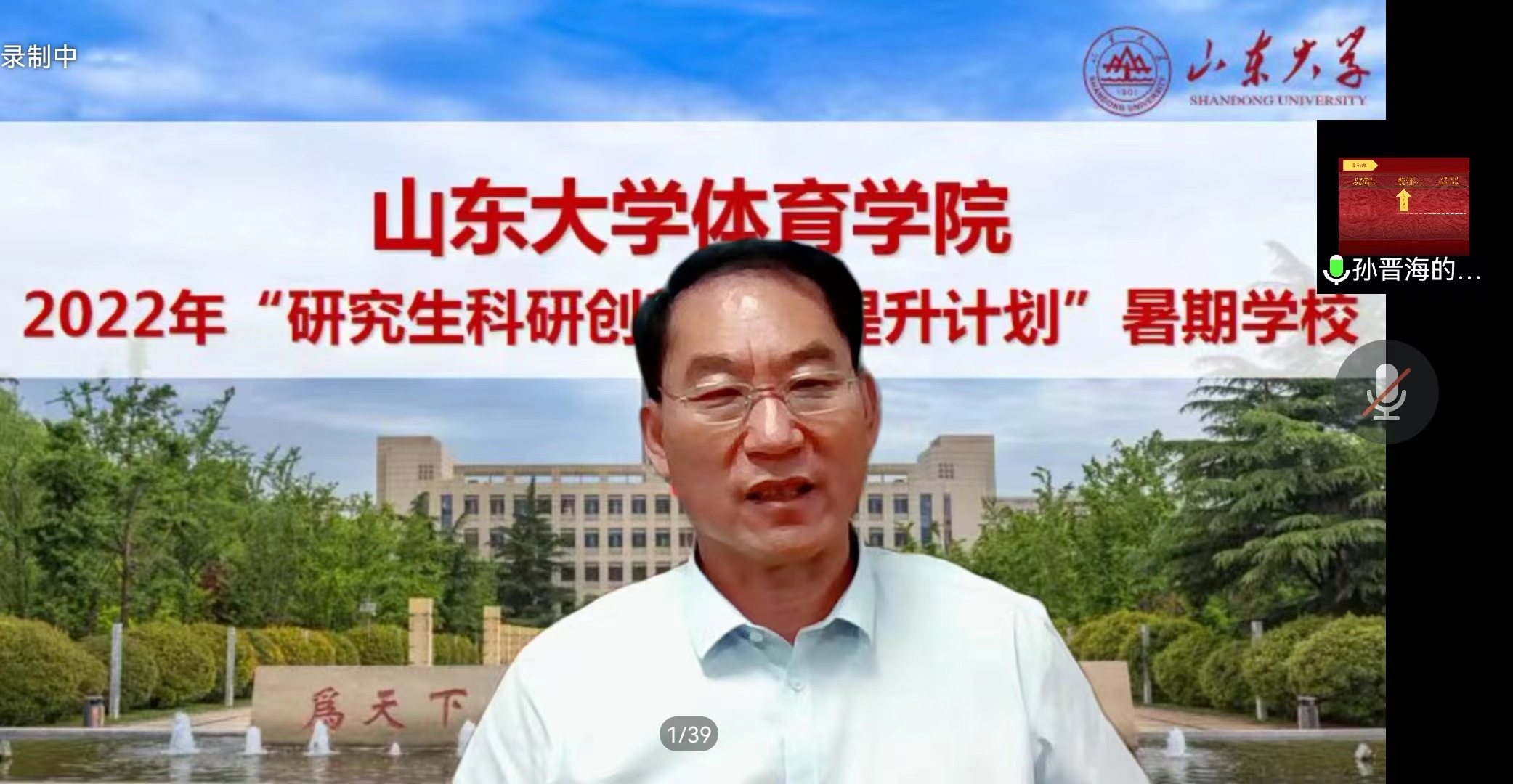 为使研究生全方位、多视角领略体育各领域发展前沿,深刻把握科研动态,拓宽研究视野,进而提升科研能力水平,7月4日,新葡萄AMG官方网站通过腾讯会议线上举行2022年“研究生科研创新能力提升计划”暑期学校开班仪式暨第一讲。新葡萄AMG官方网站院长孙晋海,副院长高岩、研究生秘书兼班主任崔莉莉以及2022年研究生暑期学校全体学员共110余人参加了本次开班仪式。