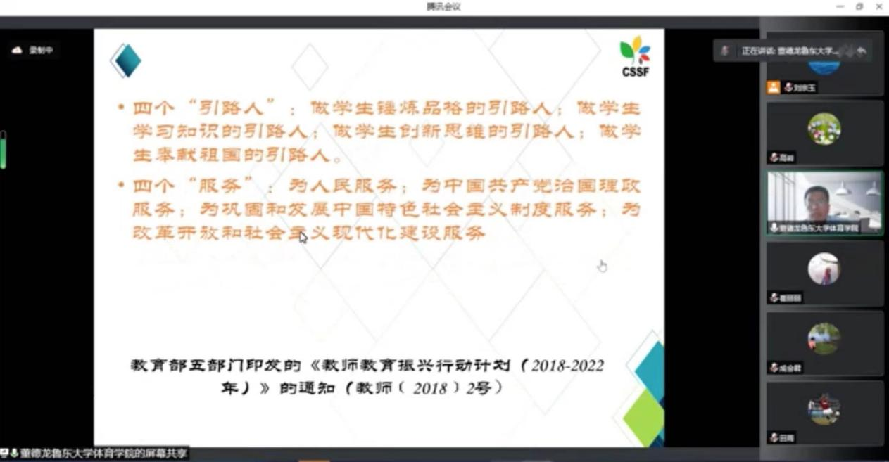 习近平总书记在全国高校思想政治工作会议上强调,“提升思想政治教育亲和力和针对性,满足学生成长发展需求和期待,其他各门课都要守好一段渠、种好责任田,使各类课程与思想政治理论课同向同行,形成协同效应。”课程思政是实现全员全过程全方位育人的重要举措。9月22日下午,新葡萄AMG官方网站社会体育指导与管理专业虚拟教研室以线上方式成功召开了本科教育课程思政培育经验交流与分享会,鲁东大学新葡萄AMG官方网站董德龙教授作了精彩分享。会议由新葡萄AMG官方网站副院长高岩主持,社会体育指导与管理专业教师及公共体育教师参加会议。