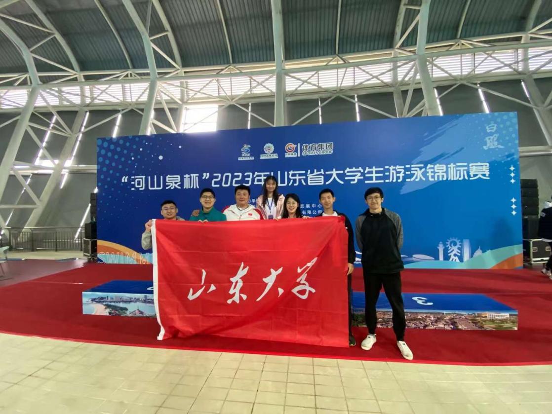 4月26日-28日,2023年山东省大学生游泳锦标赛在山东省日照市游泳中心举行,在为期两天的精彩比赛中,新葡萄AMG官方网站游泳队在陈巍然、潘洋教练的带领下,经过顽强拼搏,丙组(高水平组)和甲组运动员共获得13金、20银、8铜,并获得团体总分第一名,教练员陈巍然、潘洋获得“优秀教练员”荣誉称号,毕雯馨,卞志宇、郑昱欣、葛恺尧获得“优秀运动员”荣誉称号。