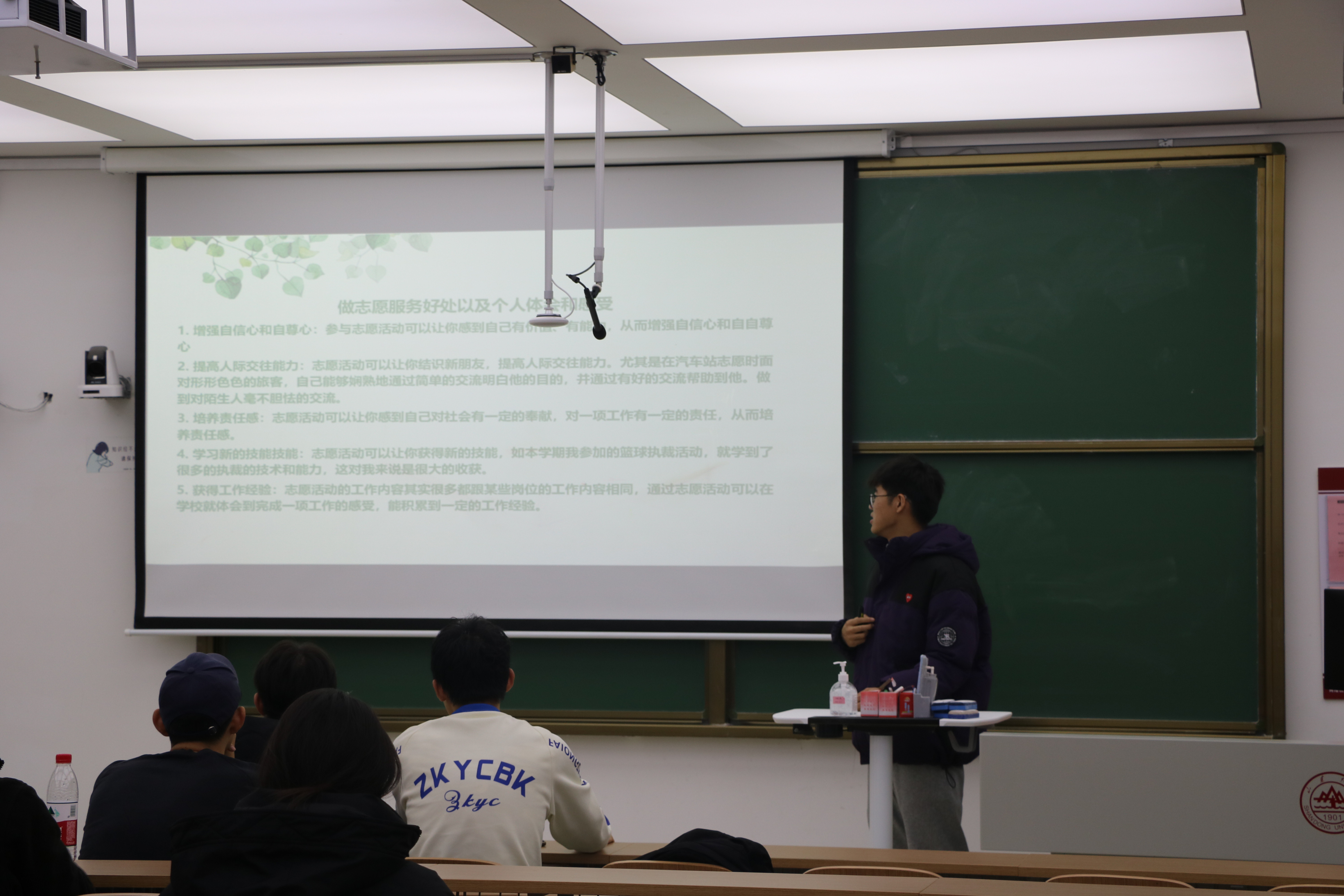 优秀志愿者甘文浩,通过与同学互动交流,引导大家体会在校期间志愿服务对我们大学生成长的意义。他说,大学期间不单单是学习,这些志愿活动是大学生提升自己的重要方式,大学生要跳出书本,通过积极参加志愿服务活动,学会从社会服务与实践的角度来看待问题。