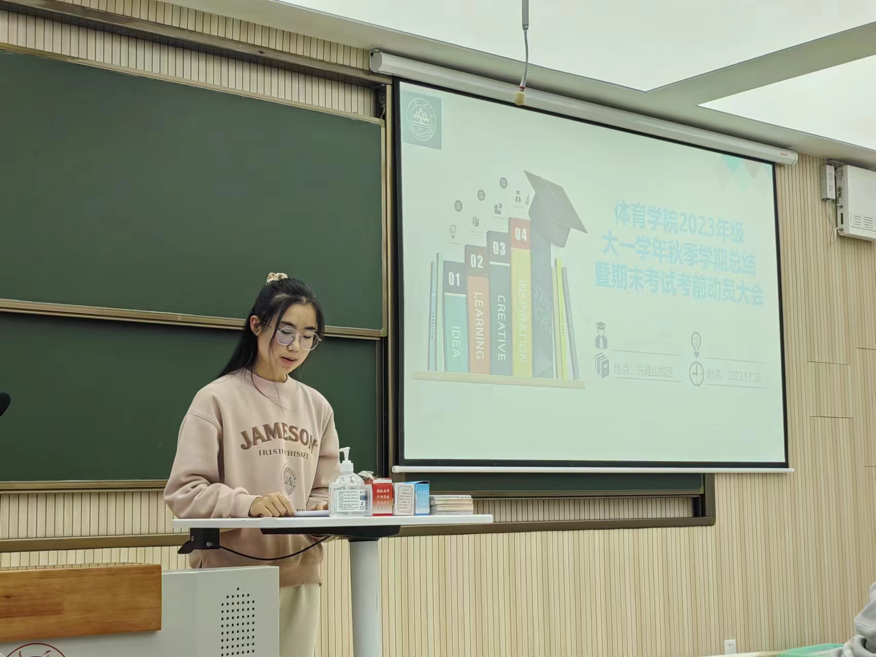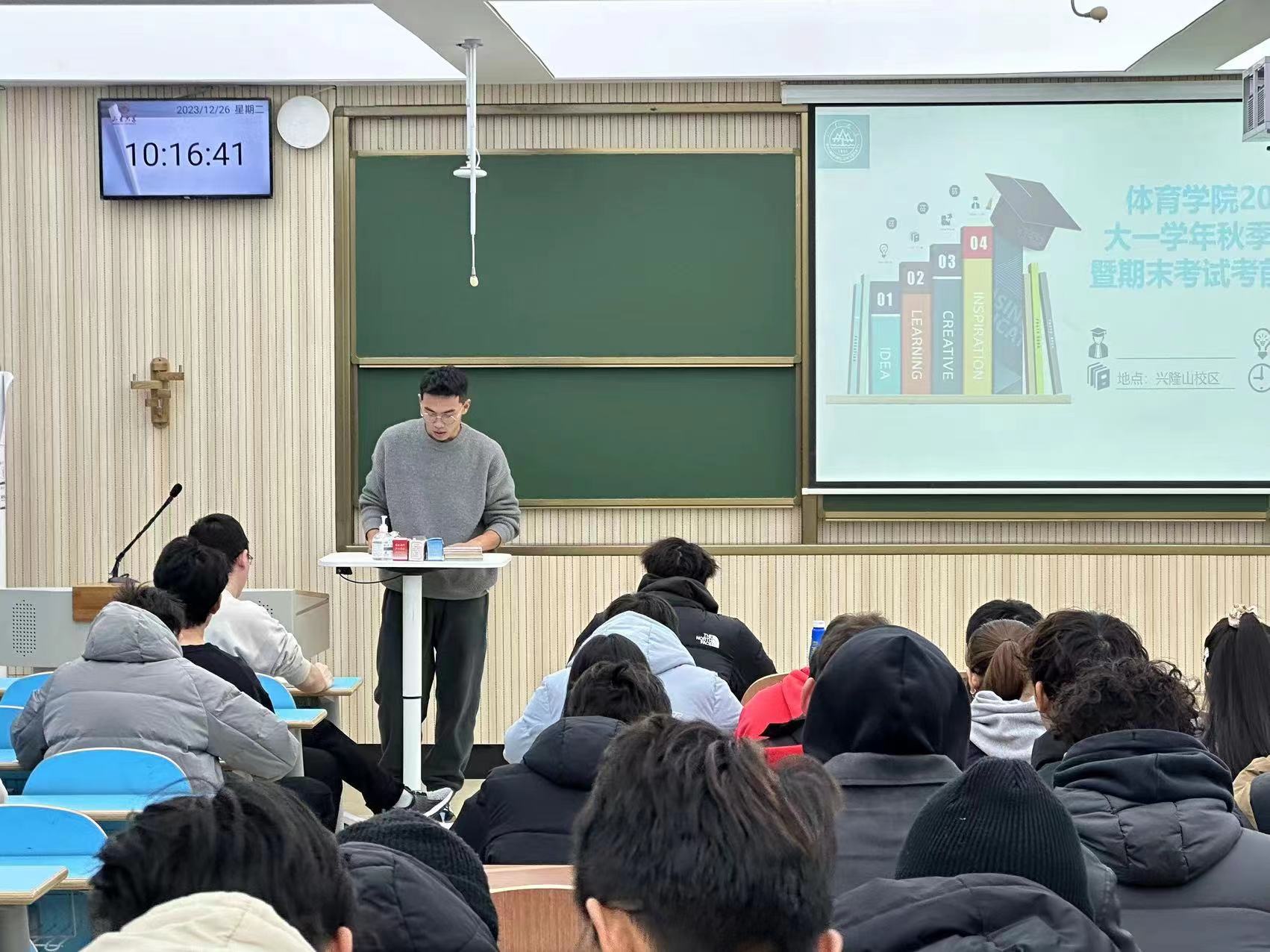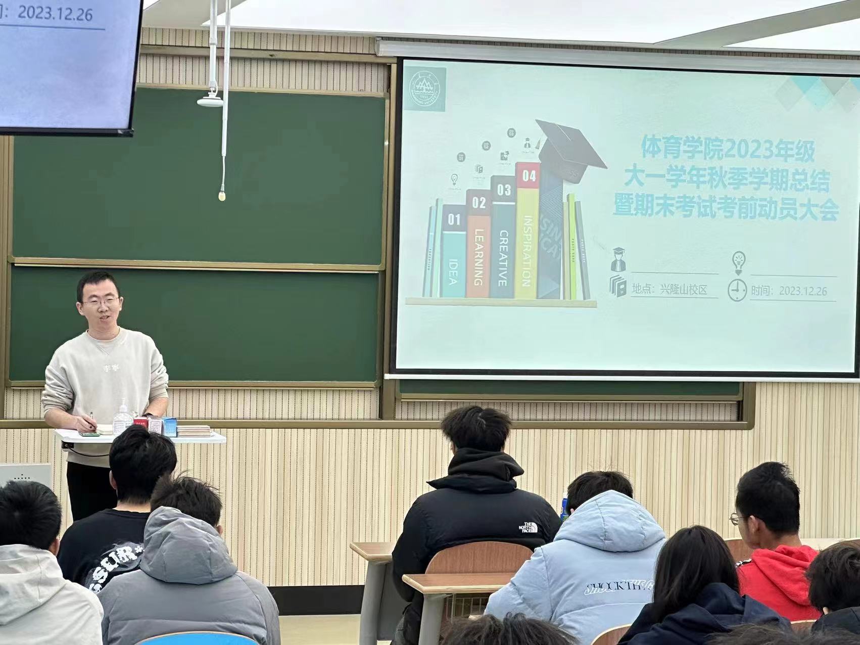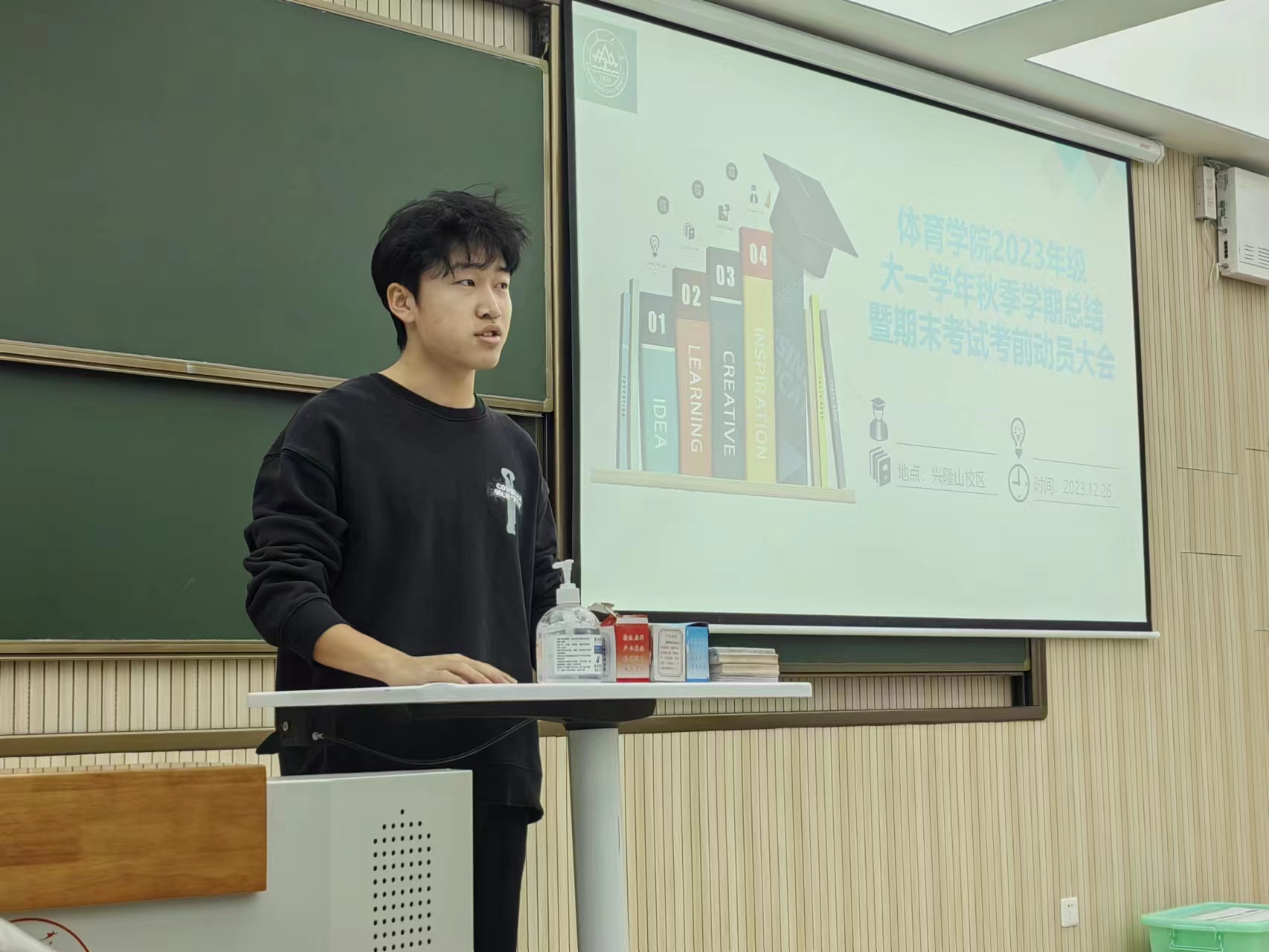 会上,学院2023级本科各班级依次进行了学期工作总结。屈蕊代表23级社体1班回顾了本学期班级各项工作活动开展情况,李祖熙代表23级社体2班总结了本学期专业课程学习和课外能力拓展情况,曹子晗代表社体高班级总结了高水平运动员本学期收获与成长、指出自查发现的问题和不足,李德恩代表管理体班级认真分析了期末考试的备考各项准备工作。辅导员范泽斌对各班级学期总结进行了点评,他提到大一学年第一学期是新生入学后学习生活各方面快速适应的关键时期,本学期全年级思想积极向上、学风作风优良、活动开展有序,做到了很好有效的新生适应,为未来更好的学习生活打下坚实基础。