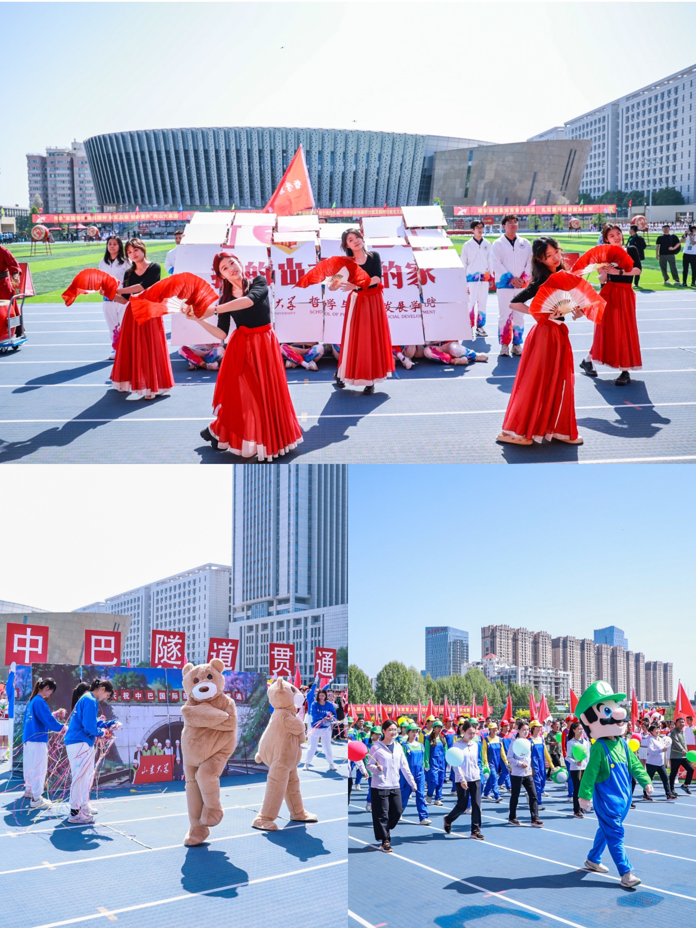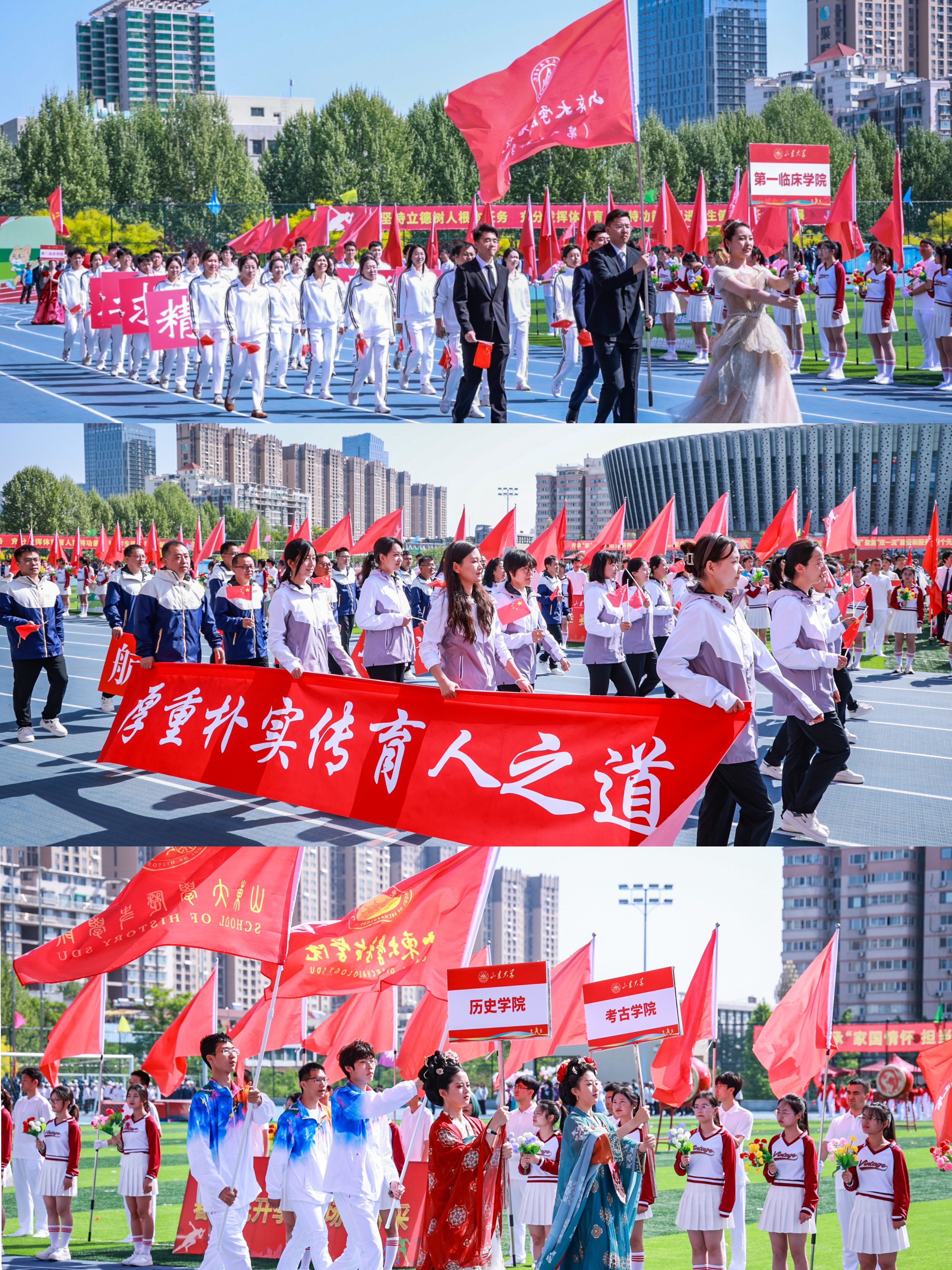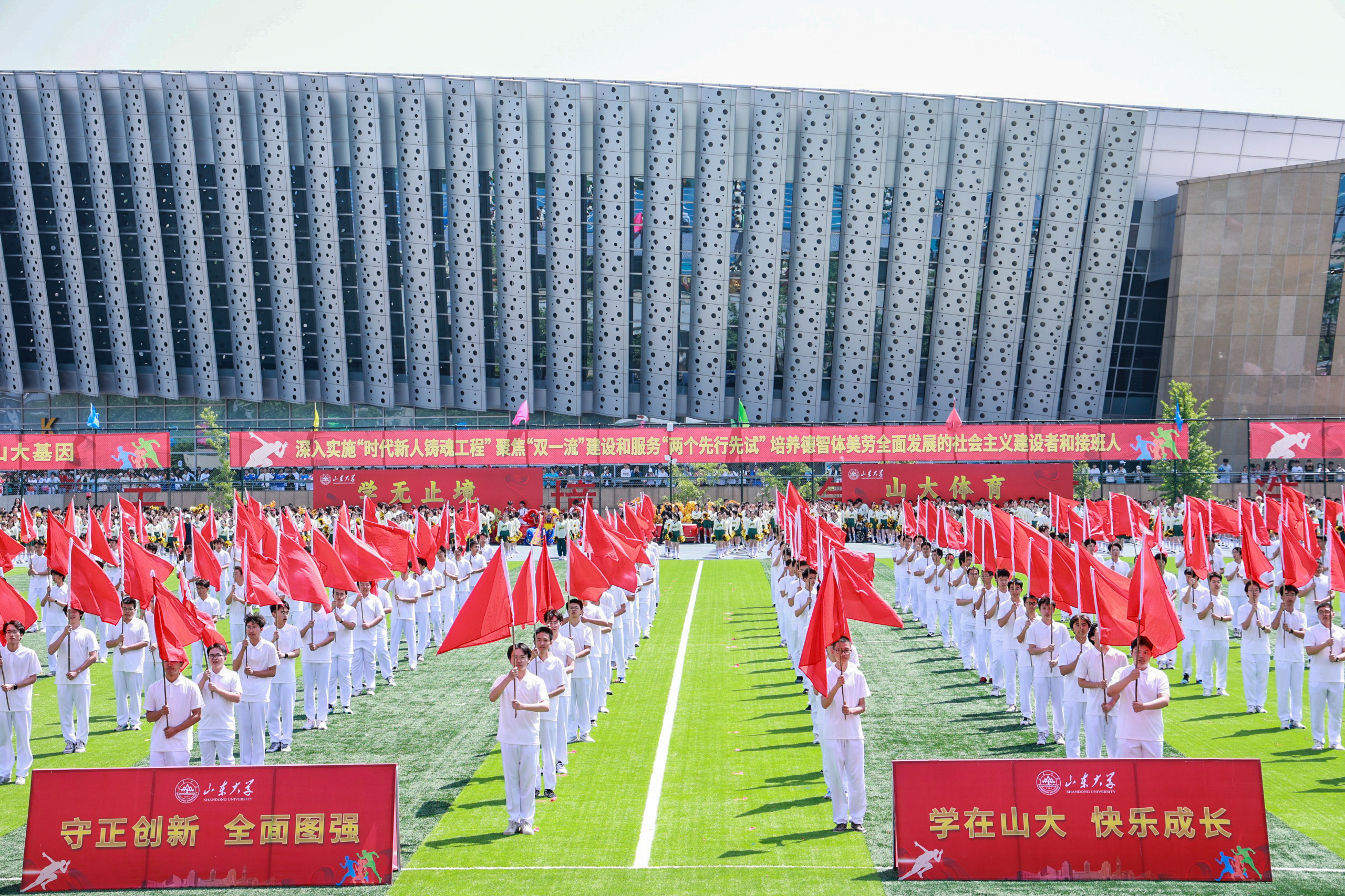 开幕式上,伴随着轻快活泼的《沂蒙山小调》,国旗方队、国旗护卫队、由6位高层次青年学者护卫的校旗方队、由6位体育学生达人护卫的校徽方队,以及标语、花束、红旗等方队率先走过主席台。随后,裁判员、运动员方队迈着矫健的步伐依次入场。他们结合学科特点和专业特色,精心准备标语和口号,并进行精彩的表演,层出不穷的花式造型和新颖创意引起现场观众的热烈响应,充分展示出“人人爱运动,无处不体育”的文化氛围。