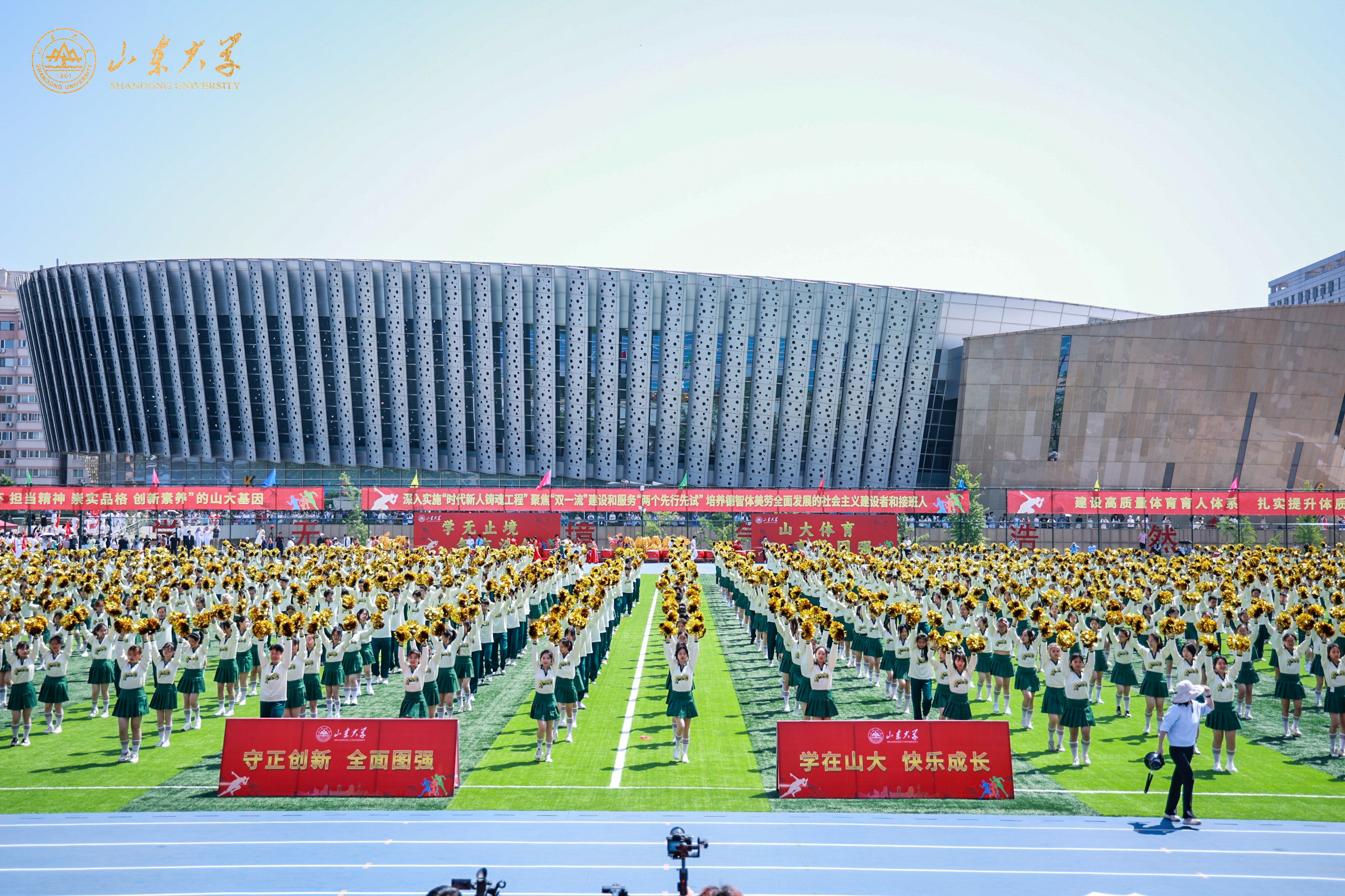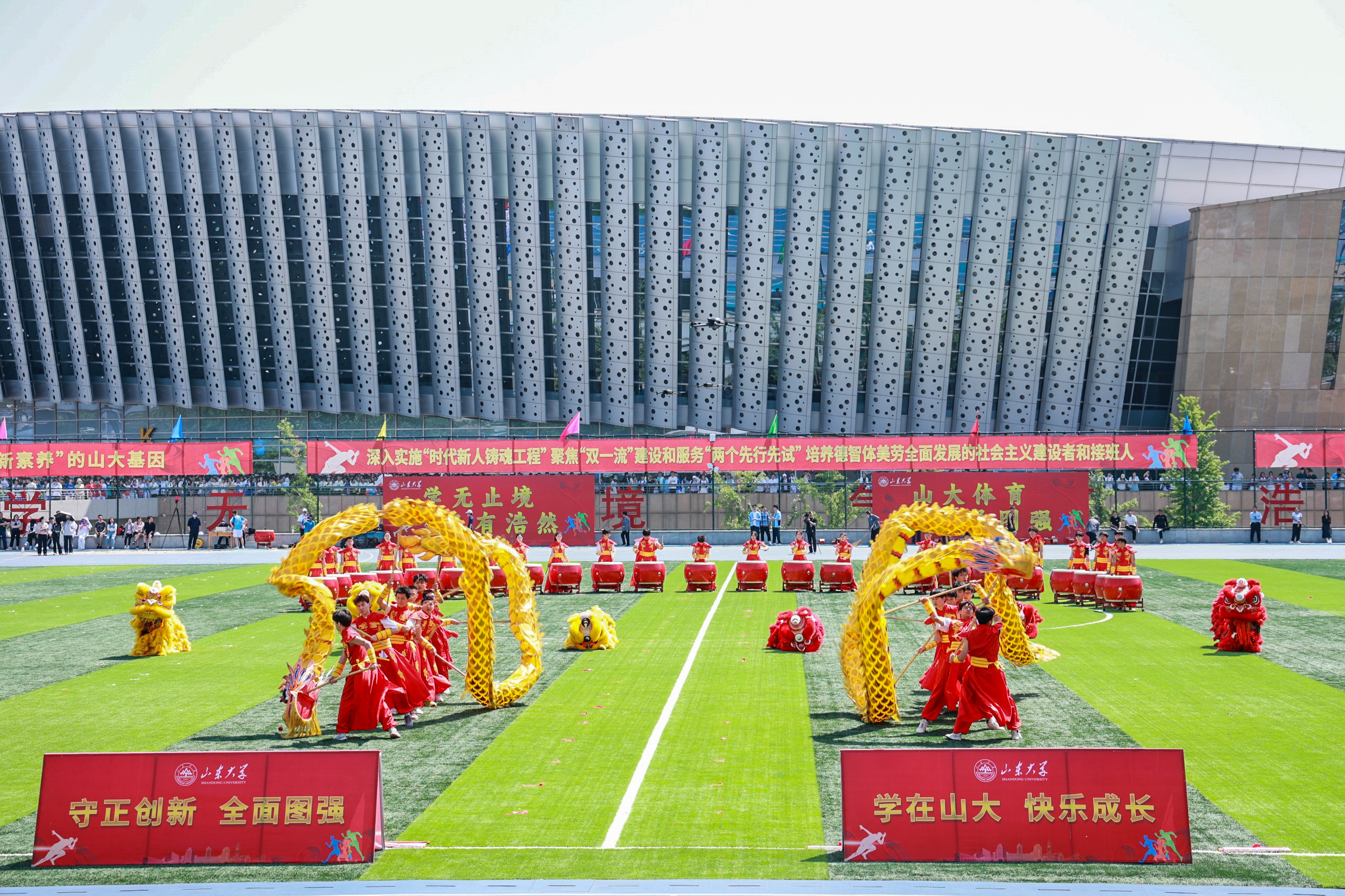 任友群宣布运动会开幕,精彩的舞龙舞狮打击乐团体表演拉开团体操表演的的序幕,“龙腾虎跃势图强,奋楫逐梦谱华章”,来自新葡萄AMG官方网站、艺术学院的80余名学生秉承中华龙狮精神、伴随铿锵有力的鼓点,一同奏响新时代“新葡萄图强”的炫彩华章;“武”旗表演——雏鹰展翅、壮志飞扬,电气学院、材料学院、土建学院、齐鲁交通学院的500名学生手持红旗,“武”动青春,汇聚成一道波澜壮阔的风景线;四位教师联袂编创,五个校区十九个学院共900余名健美操选修课学生倾情演绎“春山莫负,舞动青春”,舞姿优美,健美的身影在绿茵场上热烈激昂。
