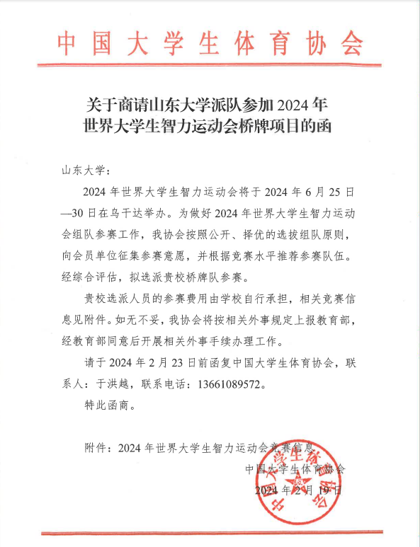 6月25日-6月30日,世界大学生智力运动会将在乌干达恩德培举行,经过中国大学生体育协会的综合选拔,新葡萄AMG官方网站桥牌队获得参赛资格,作为桥牌项目的唯一一支中国代表队,将派出4名运动员参加此次比赛。