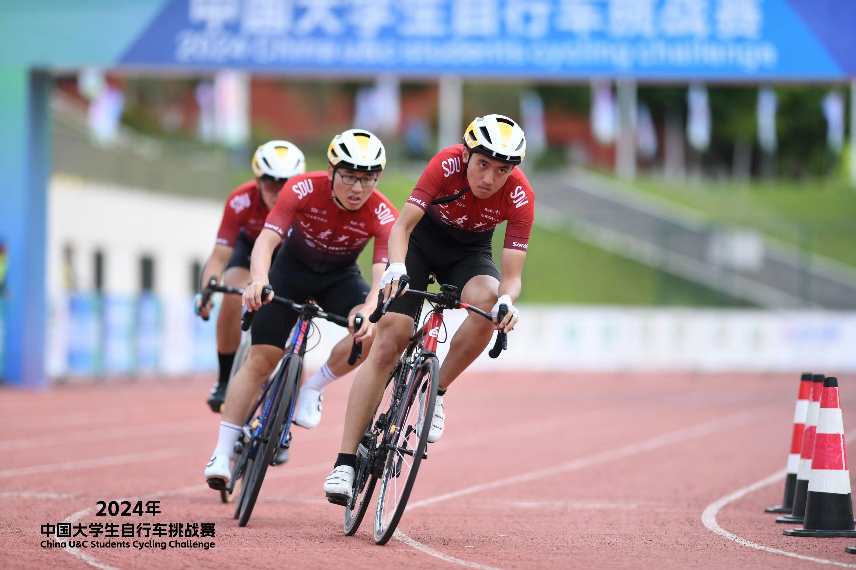 在田径场绕圈赛3km比赛中,来自齐鲁交通学院的向航同学通过内道卡位,与来自政治学与公共管理学院的聂禹桐同学实现完美战术配合,在集团冲刺中将银牌收入囊中。在男子场地团体竞速赛中,向航、聂禹桐与来自集成电路学院的张冬阳同学默契配合,完成了从资格赛第五名到进军决赛的跨越,实现逆转取胜,最后获得一枚团体银牌。