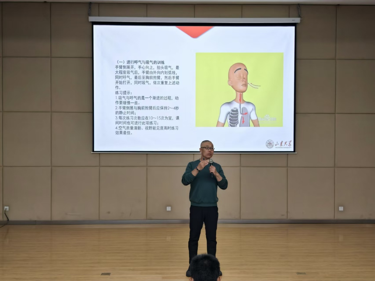 张军教授简单介绍了《学生体质测量健康标准》的要求,并从50 米跑、立定跳远、仰卧起坐、引体向上、坐位体前屈等项目发力的肌肉和练习目的进行讲解和答疑。然后对肺活量的训练方法进行了着重讲解,并且播放了关于腹式呼吸训练方法的视频便于同学们理解。