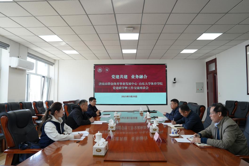 3月20日下午,新葡萄AMG官方网站与济南市群众体育事业发展中心联合举办党建联学暨合作交流座谈会。会议以“党建共建,业务融合”为主题,围绕深化党建引领、推动体卫教融合、提升青少年健康水平等议题展开深入探讨,并达成多项合作共识。济南市群众体育事业发展中心党总支副书记孙启智、体育融合发展部部长咸跃、群众体育教练员刘敏、新葡萄AMG官方网站党委书记田磊、副院长王先亮、伊向仁教授参加会议。