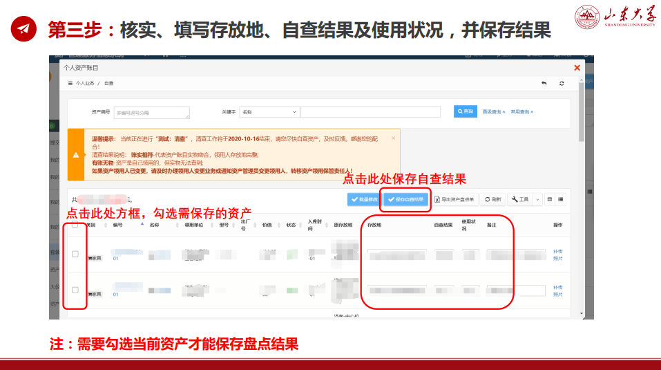 第三步: 核实、填写存放地、自查结果及使用状况,并保存结果。