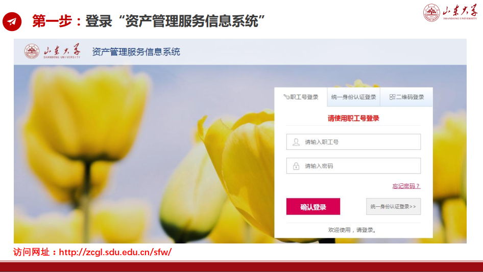 第一步: 登录“资产管理服务信息系统”,访问网址:http://zcgl.sdu.edu.cn/sfw/