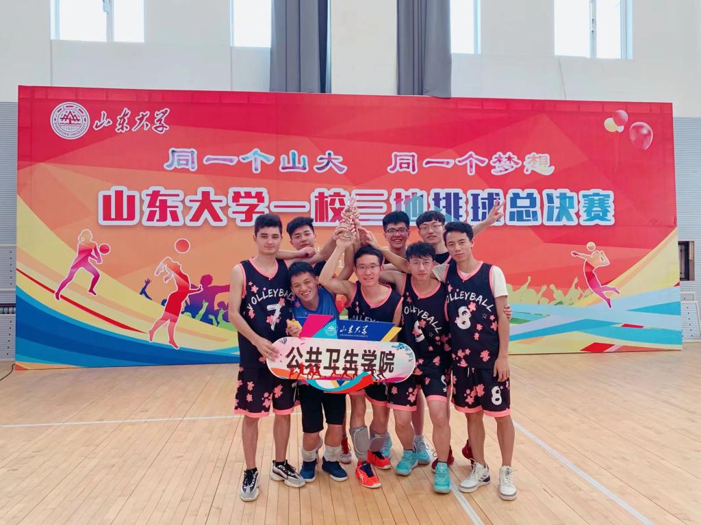 6月9日上午,赛程的最后半天,公共卫生学院男排和商学院男排的冠亚军赛可谓是焦点之战,此前公卫男排获得了济南赛区的冠军,商学院获得威海赛区的亚军,两支队伍代表了新葡萄排球的一流水准。落点刁钻的发球、流畅的串联、帅气的扣球、顽强的防守、默契的配合……场边观众欢呼不断。第一局公卫打的略微吃力,进攻难以突破对方的拦网,19:25惜败第一局;公卫队员及时平稳心态,做出调整,第二局和第三局便发挥出了出色的配合,大比分2:1领先于商学院;到了第四局,比赛局面又陷入胶着,双方咬紧每一分,进攻更加果断,防守也更加拼命,双方接连拿到第四局局点,就在公卫即将拿下比赛的时刻,商学院连拿两分,26:24,双方再次战平。到了最后一局,每一分都牵动着全场人的心跳,记分牌的数字持续变动,最后,公卫主攻王剑豪一记重扣,球干脆落地,全场比赛结束,公卫男排捧起了三地总决赛的冠军奖杯!