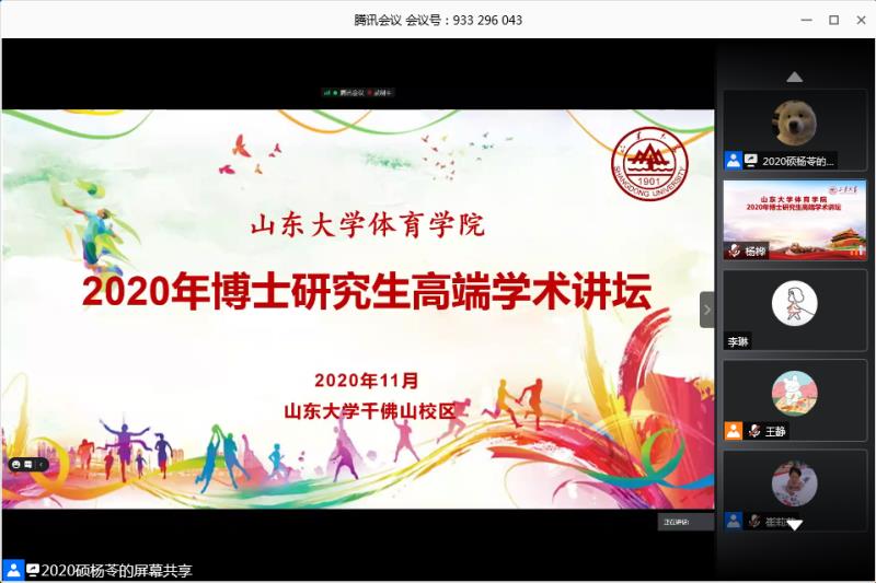 11月16日,新葡萄AMG官方网站举办的“2020年博士研究生高端学术讲坛”落下帷幕。本次学术讲坛邀请了多位国内知名专家学者,围绕体育哲学社会科学研究现状与发展趋势、健康与人格培养相融、体育科研论文的撰写规范、体育学科的发展与体育科研的趋势、智慧健身综合服务的数字逻辑与应用实践、体育口述历史在中国、运动员退役安置系统特征、演化及调控机制-基于复杂适应系统理论等,开展了广泛而深入的学习研讨,旨在进一步提升我校体育学研究生的教学质量和科研水平,不断拓宽学生的学术视野。